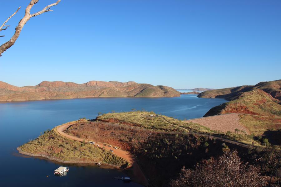 Der Lake Argyle ein Stausee , mit ca. 1000 qm liegt 70 km südlich von Kununurra. Wir besuchen das Resort und den Staudamm, dessen Abfluss in den Ord River führt.