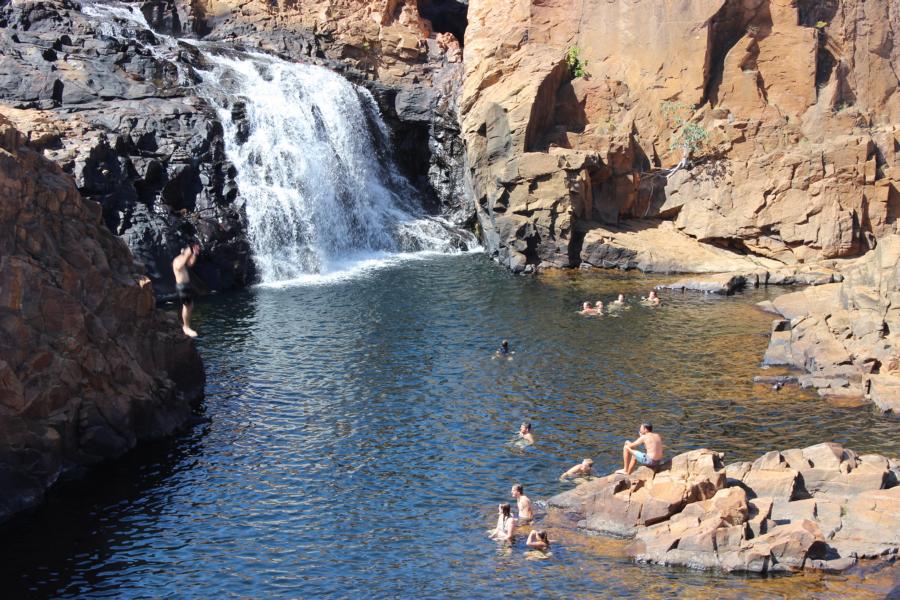 Oberhalb von Katherine liegen die Edith Falls, ein Wasserfall der sich am Rande des Arnhem Land Plateaus in einen von Panadanus Palmen umgebenen Bassin ergießt.