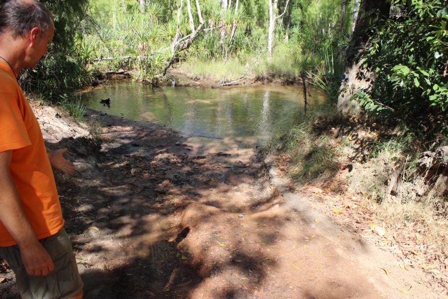 Australier sind Optimisten und leben den Ausdruck „no worries“. Die Frage wie der 43 km lange Track durch den Litchfield Park ist, wurde mit „easy“ beantwortet. „unsere Gäste“ so der Campingplatzbetreiber fahren den Track return als Tagestrip und schauen sich dabei auch noch den Park an. Und was brauchen wir, – fast 5 Stunden – und das einfach. 5 Flussdurchquerungen, 2 davon über 50 Meter lang und Wassertiefen bis zu 50 cm. Gelände, dass nur Schrittgeschwindigkeit erlaubt und hohe Konzentration. Wenn’s zu brenzlich wird, steigen wir vorher aus und schauen uns die Strecke genauer an. Auf die Erkundung der Flussdurchquerungen zu Fuß, verzichten wir auf Grund der möglichen Crocs. Also „no worries“!!!!!