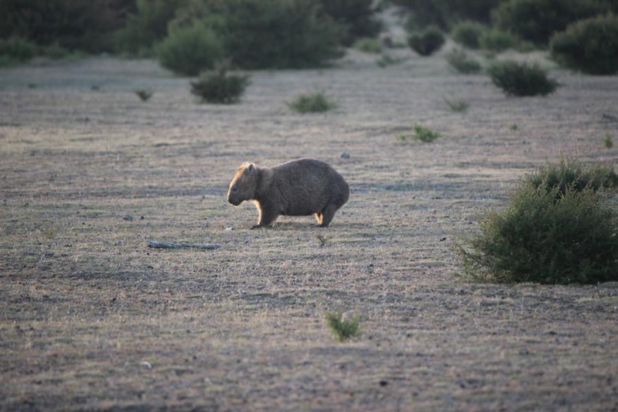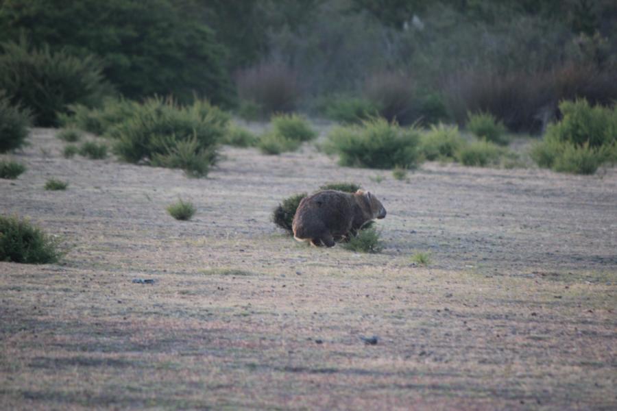 Haben bis jetzt leider nur überfahrene Wombats gesehen. Auf einer Wiese in der Nähe des Campingplatzes, Tipp vom Ranger, versuchen wir in der Dämmerung unser Glück. Und tatsächlich lässt sich ein stattlicher Wombat nicht weit von unserem Wagen blicken. Wussten nur nicht, dass er so schreckhaft ist. Bereits das einmalige Auslösen der Kamera lässt ihn verharren, um gleich darauf in einem beachtlichen Tempo das Weite zu suchen. Wenn auch nur kurz, so haben wir unseren ersten lebenden Wombat gesehen.