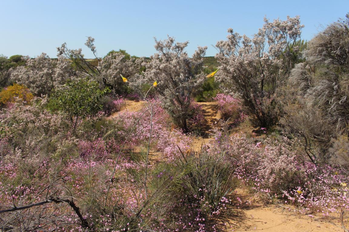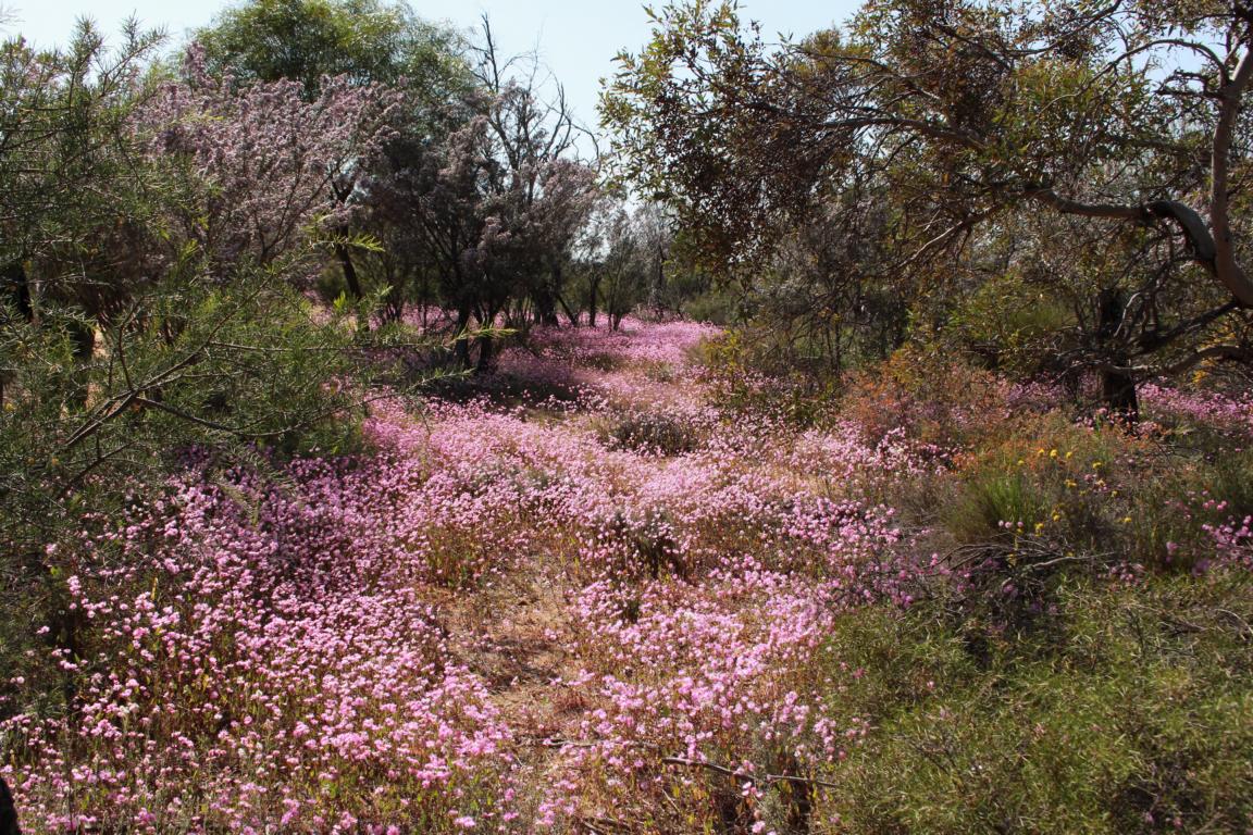 Der australische Busch blüht. Da wo sonst karge Vegetation mit roter Erde vorherrscht, erstrecken sich Wiesen aus blühenden Blumen, Büschen und Bäumen.