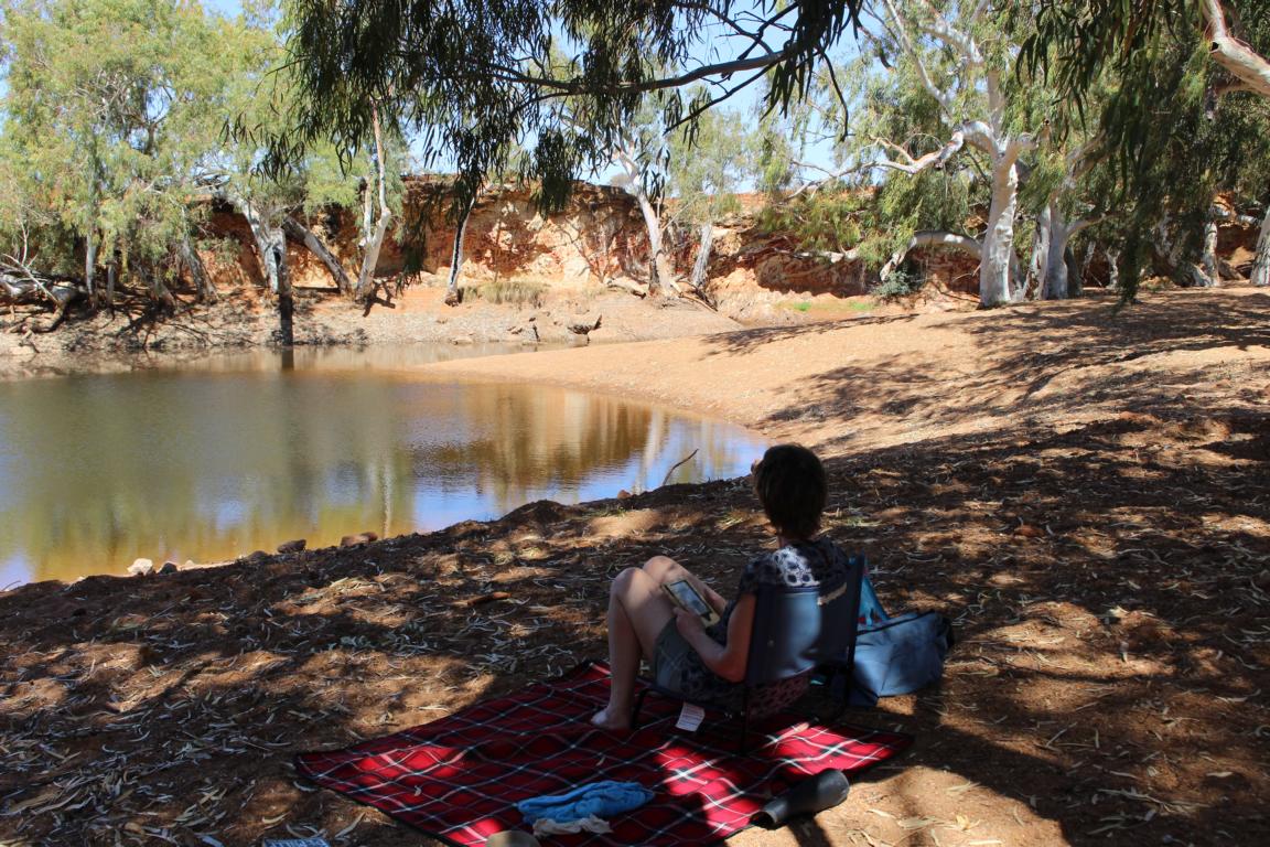 Unsere Pläne noch einmal zur Kennedy Range zu fahren sind auf Grund eines Mining Unfalls nicht möglich. Die Straße zum Park wurde beschädigt und ist für Wochen gesperrt. Zum Glück erfahren wir davon bei einem Ratsch mit Australiern am Bilung Pool und fahren nicht umsonst die 300 Kilometer nach Norden. Die Alternative fällt uns nicht schwer und bleiben gleich am Bilung Pool. Eine grüne Oase inmitten des australischen Outbacks mit alten River Gums, bunter Vogelwelt und einem schönem Pool zum Schwimmen.