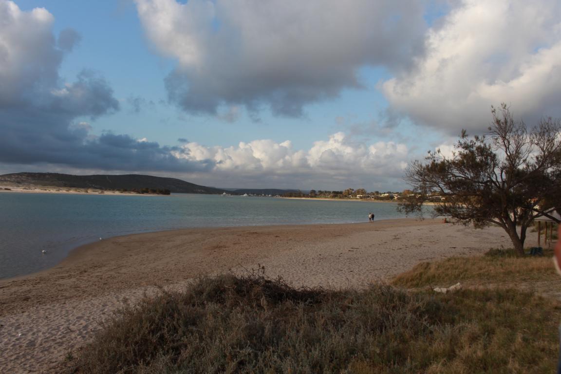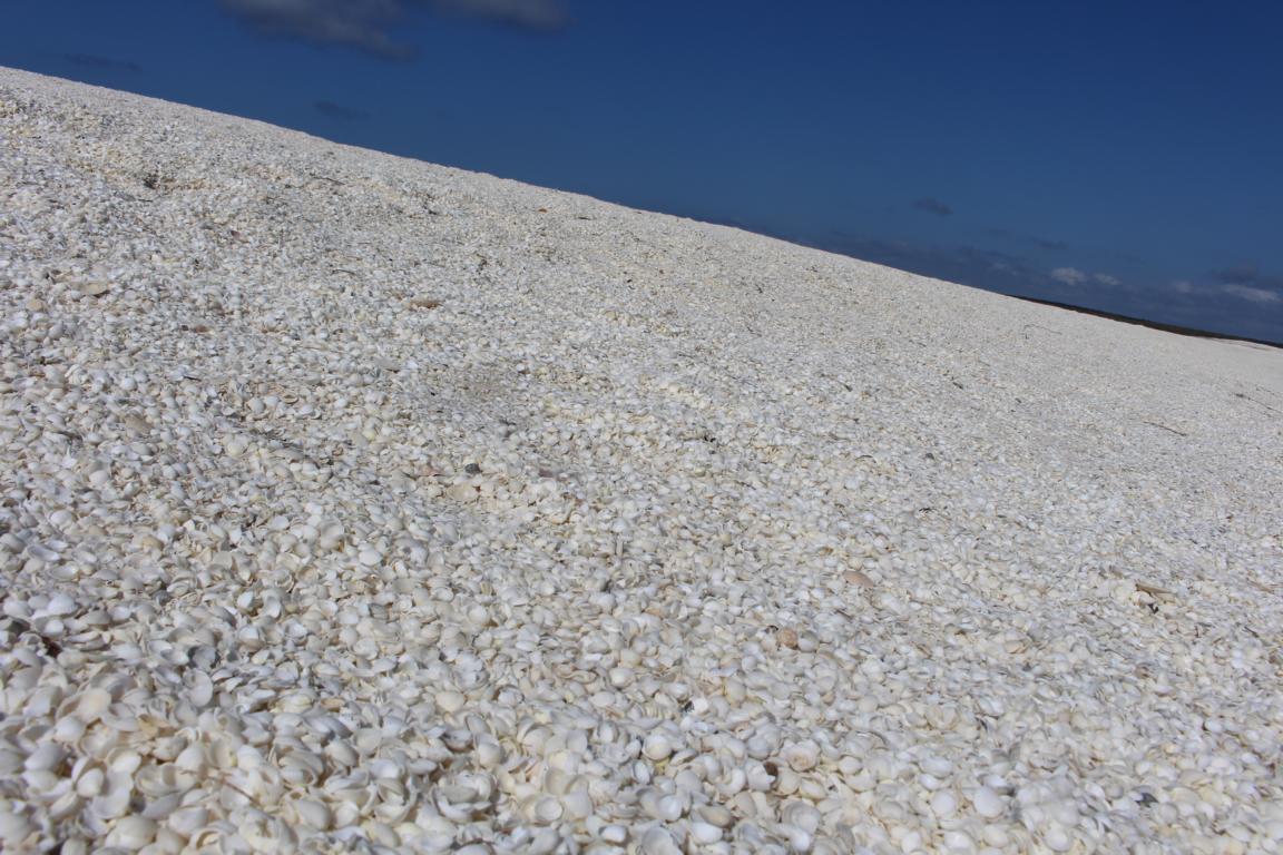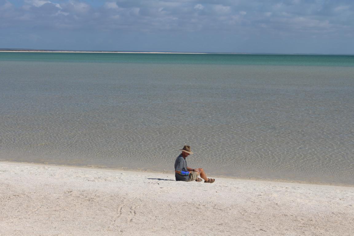 Nach den Stromatolithen folgt ein 120 Kilometer Küstenabschnitt mit kleinen weißen Muschelschalen, die sich bis zu einer Dicke von 12 Metern auftürmen. In Ermangelung von Ziegeln verwendeten frühere Siedler, die mit den Jahren fest gepressten Muscheln als Quader für ihre Häuser. Wir fahren zum Shell Beach und spielen sitzend mit den Muscheln.