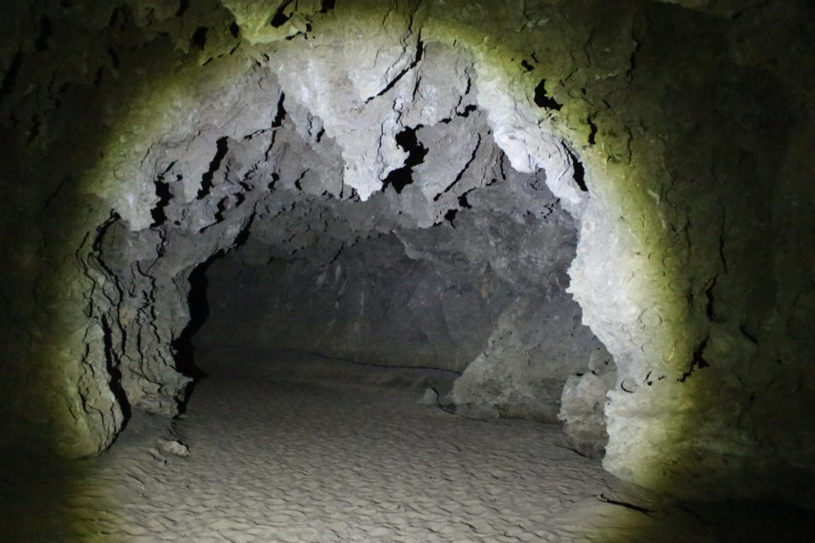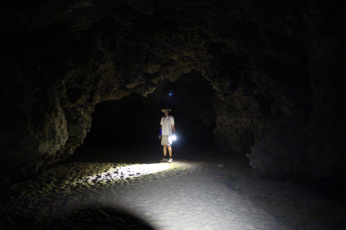 Zuerst führt der Weg durch ein Bachbett mit grüner Vegetation. Schließlich erreichen wir den Eingang der Höhle. Sie ist 330 Meter lang, windet sich durch den Berg, ist stockdunkel und an manchen Stellen 30 Meter hoch und 20 Meter breit. Der Boden der Höhle ist das sandige Flussbett. Bei starken Regenfällen kann die Höhle zur tödlichen Falle werden und über die Jahre hat sich der Fluss durch den Berg gegraben.