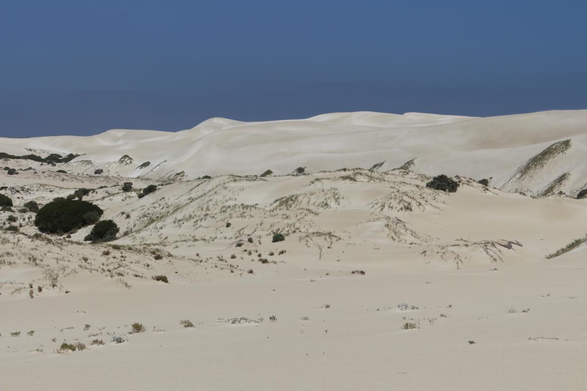 Weiter geht es nach Fowlers Bay, wo wir schon wieder nicht direkt hinkommen. Riesige Sanddünen locken und natürlich müssen wir dort hin. Kein Mensch ist dort und wir wandern durch den schneeweißen Sand.