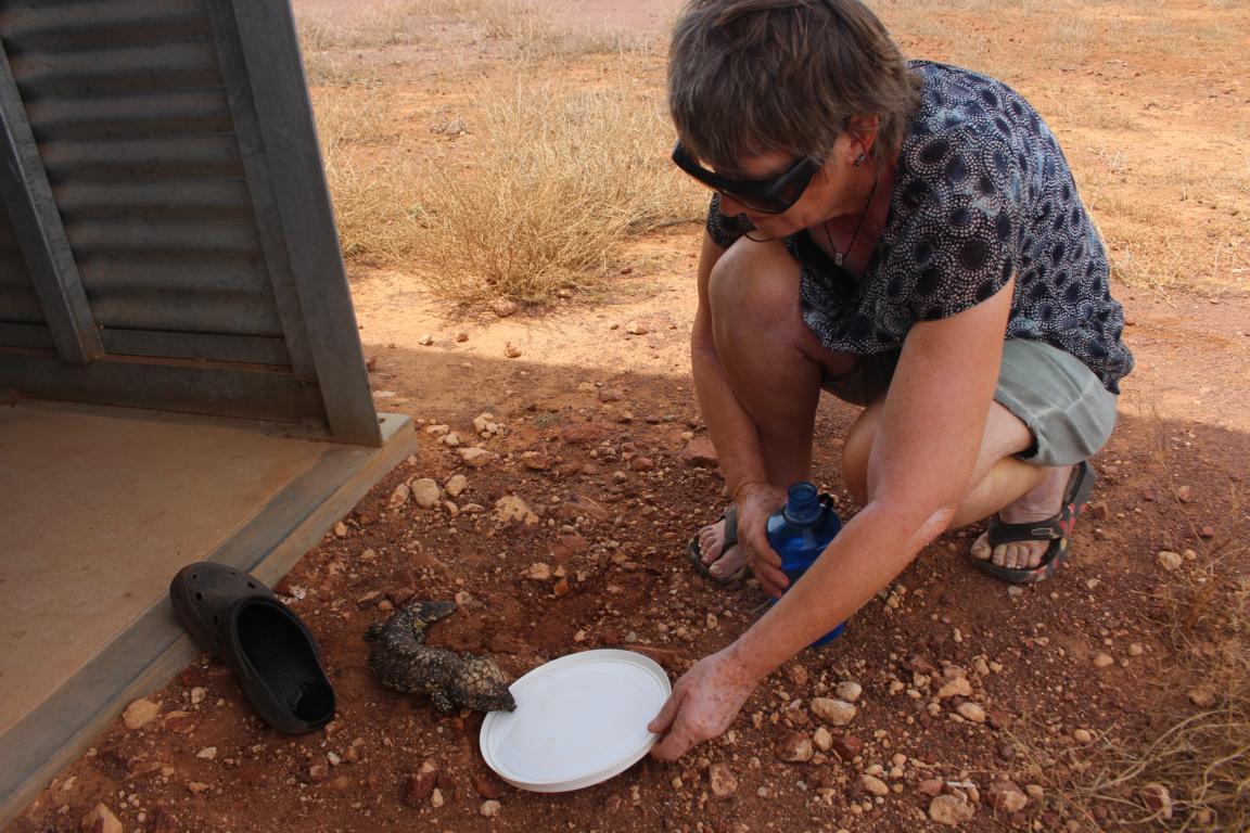 An der alten Schafscherer Station finden wir in dem kleinen Toilettenhäuschen einen entkräfteten und dehydrierten Blue-tongue Lizard. Er hat anscheinend den Weg aus dem WC nicht gefunden und bei der Hitze und der geringen Besucherzahl wahrscheinlich mehrere Tage darin verbracht. Von einem Deckel trinkt er gerne das angebotene Wasser. Das WC steht ohne Schatten weit und breit in der Sonne, kein guter Platz um den kleinen Kerl dort zu lassen. So bugsieren wir ihn vorsichtig in unsere Schüssel und tragen ihn in den Schatten eines Busches. Die Plastiktüte schafft ein kleines Wasserbad aus dem der Lizzard weiter munter weiter trinkt. So langsam merken wir, dass er wieder zu Kräften kommt. Er kann schon wieder auf seinen Füßen stehen und mit der Hoffnung auf seine eigenen Fähigkeiten und den besten Wünschen verlassen wir ihn.