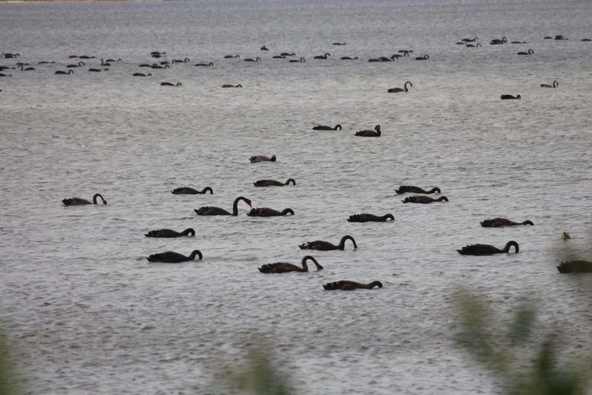 Vor Peterborough liegt ein See an der Straße. Hunderte schwarzer Schwäne paddeln entspannt auf der Wasseroberfläche und suchen nach Nahrung.