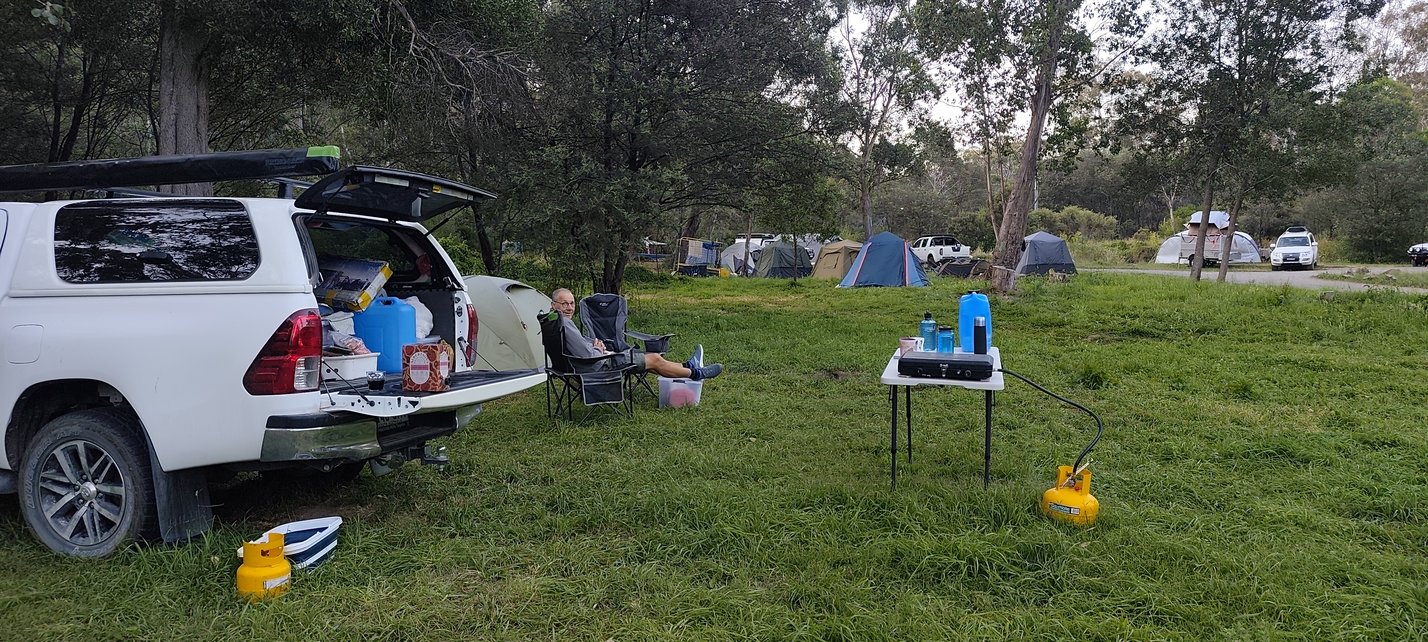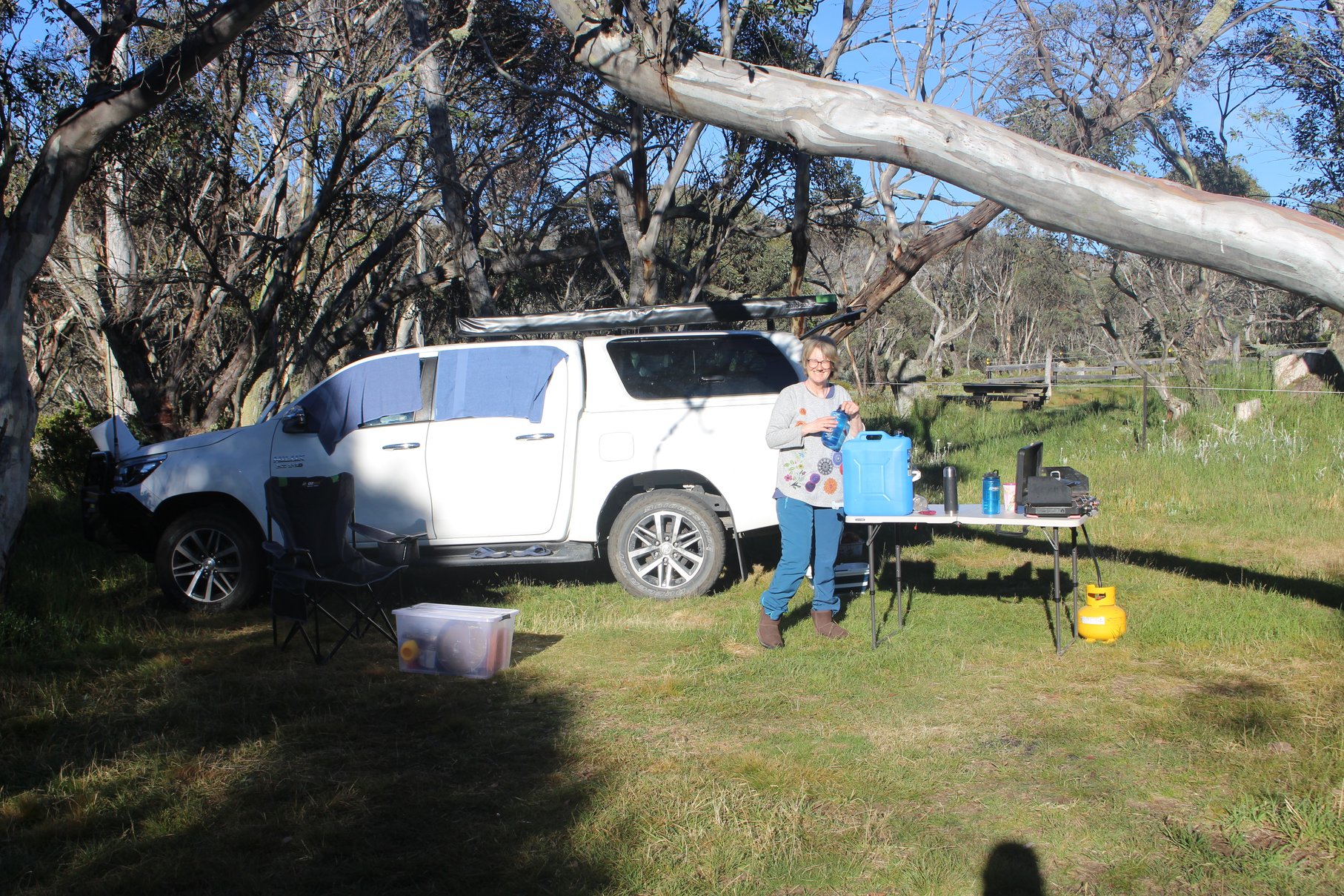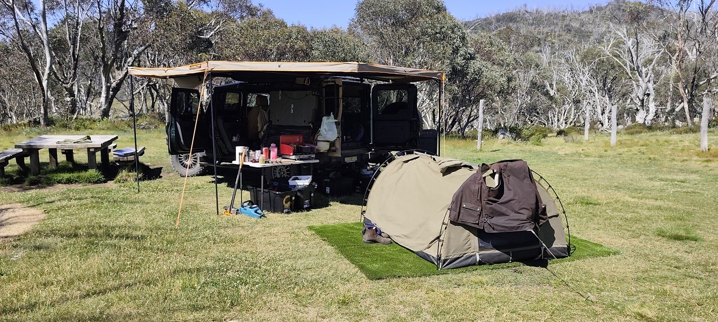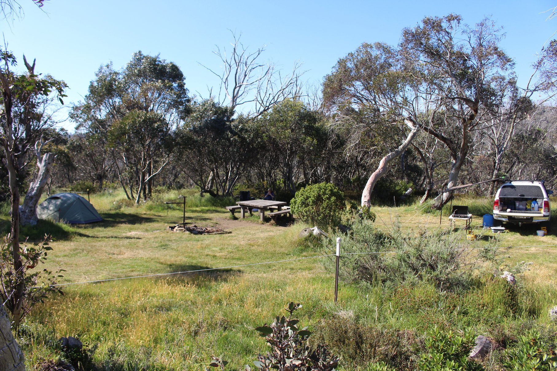 Unser Lager schlagen wir an einem urigen Platz umgeben von Snowgums, den alpinen Eukalyptusbäumen, in absoluter Ruhe auf. Lediglich 5 Plätze umfasst der Platz, wovon zwei für Pferdegruppen vorbehalten sind. Sogar Pferdekoppeln gibt es, wo die Tiere die Nacht verbringen können. Stellen es uns toll vor mit Pferden durch die High Plains zu reiten und den Abend in einem schönen Camp zu verbringen.