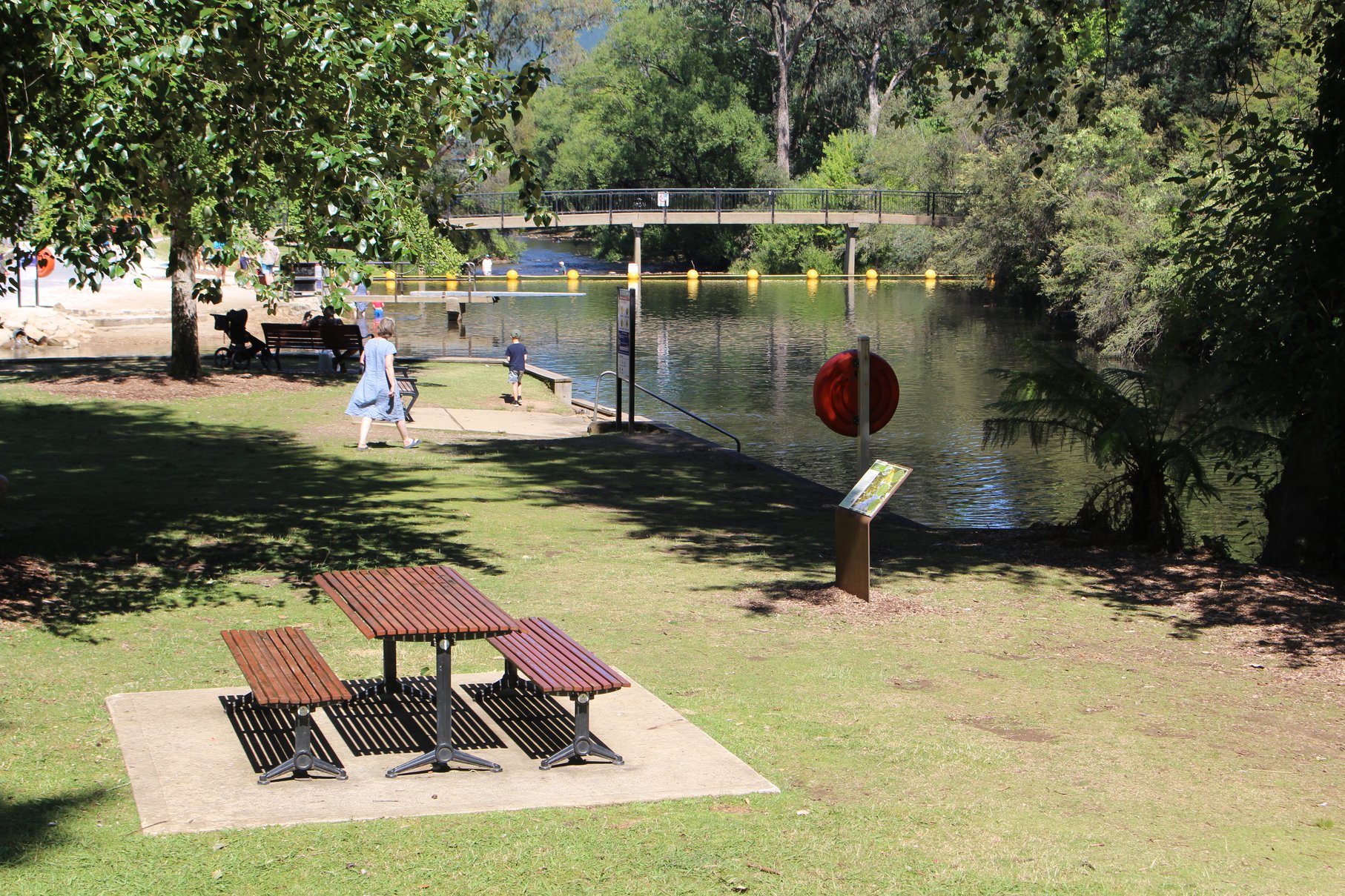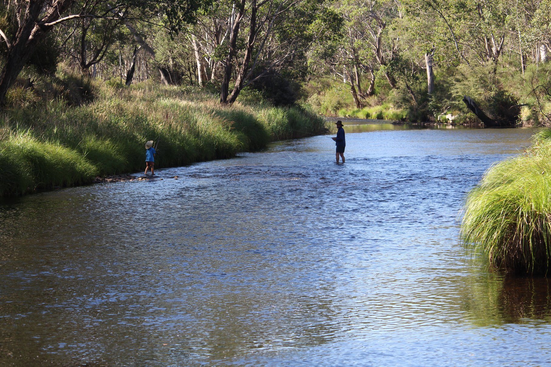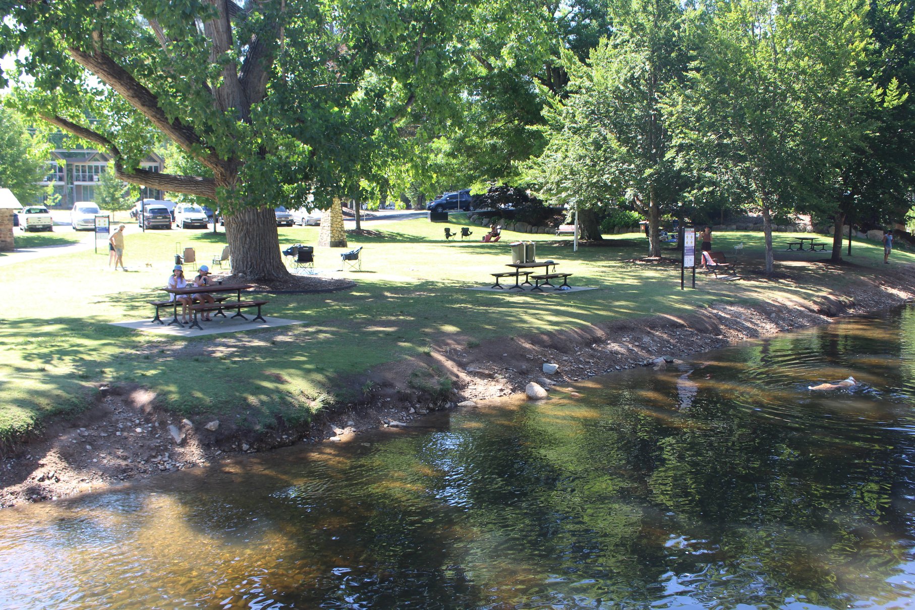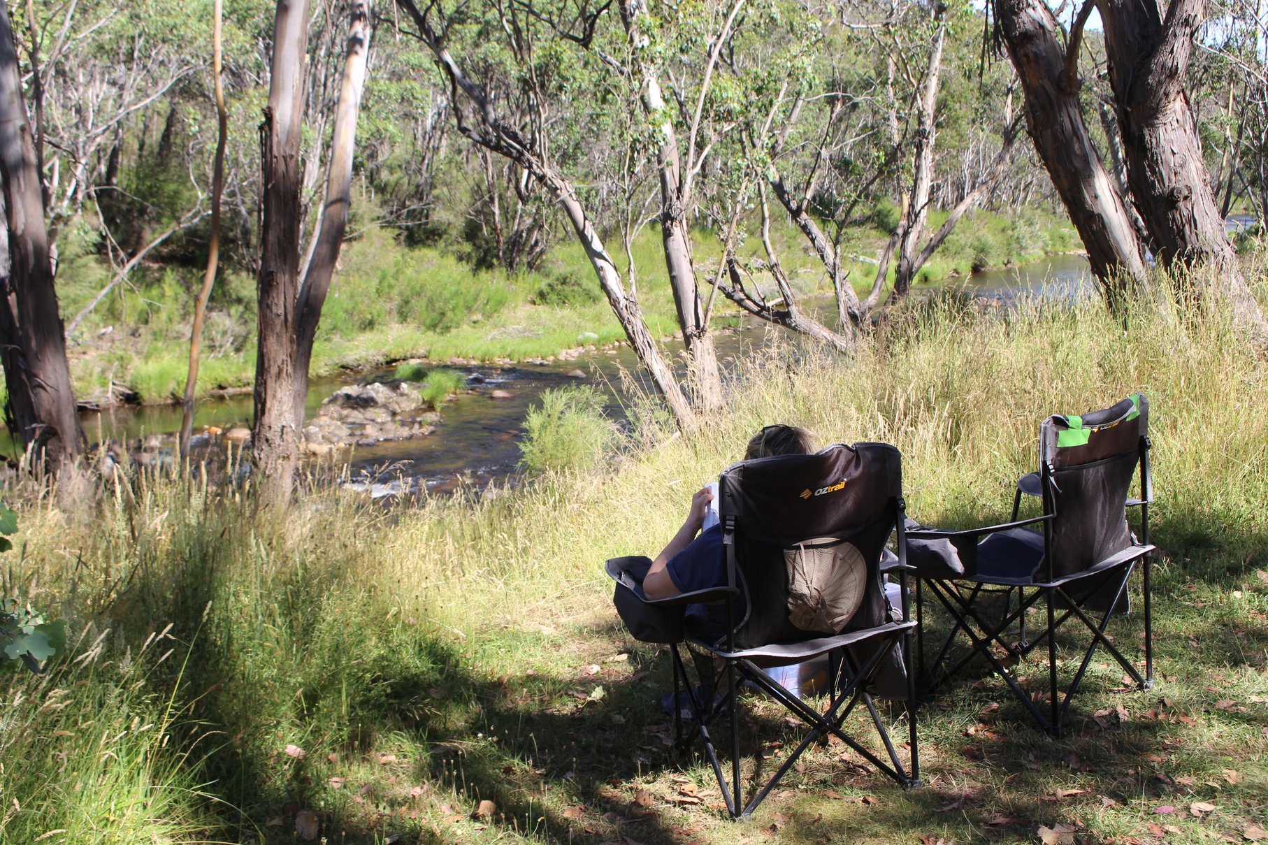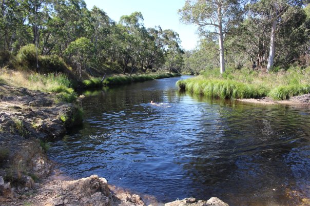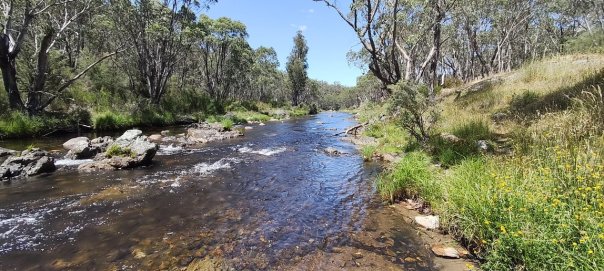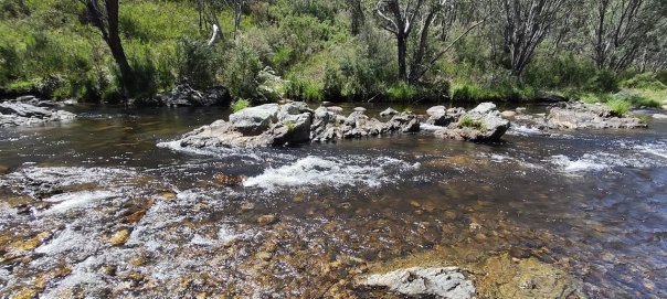 So ganz allein da oben mit den Feuern herum, wird es langsam unheimlich. Wir packen unsere 7 Sachen und fahren entgegengesetzt des Feuers auch wenn es noch 70 km von uns entfernt ist. Auf Jokers Flat am Bach, einem idyllischen Platz, setzt sich die Leere fort. Normalerweise tummeln sich in der Ferienzeit hier am Camp die Erholungssuchende und wir sind mit 2 anderen Reisenden die einzigen. Die meisten sind schon nach Hause gefahren. Umso leerer ist die Stelle im Bach, in der wir herrlich schwimmen können.