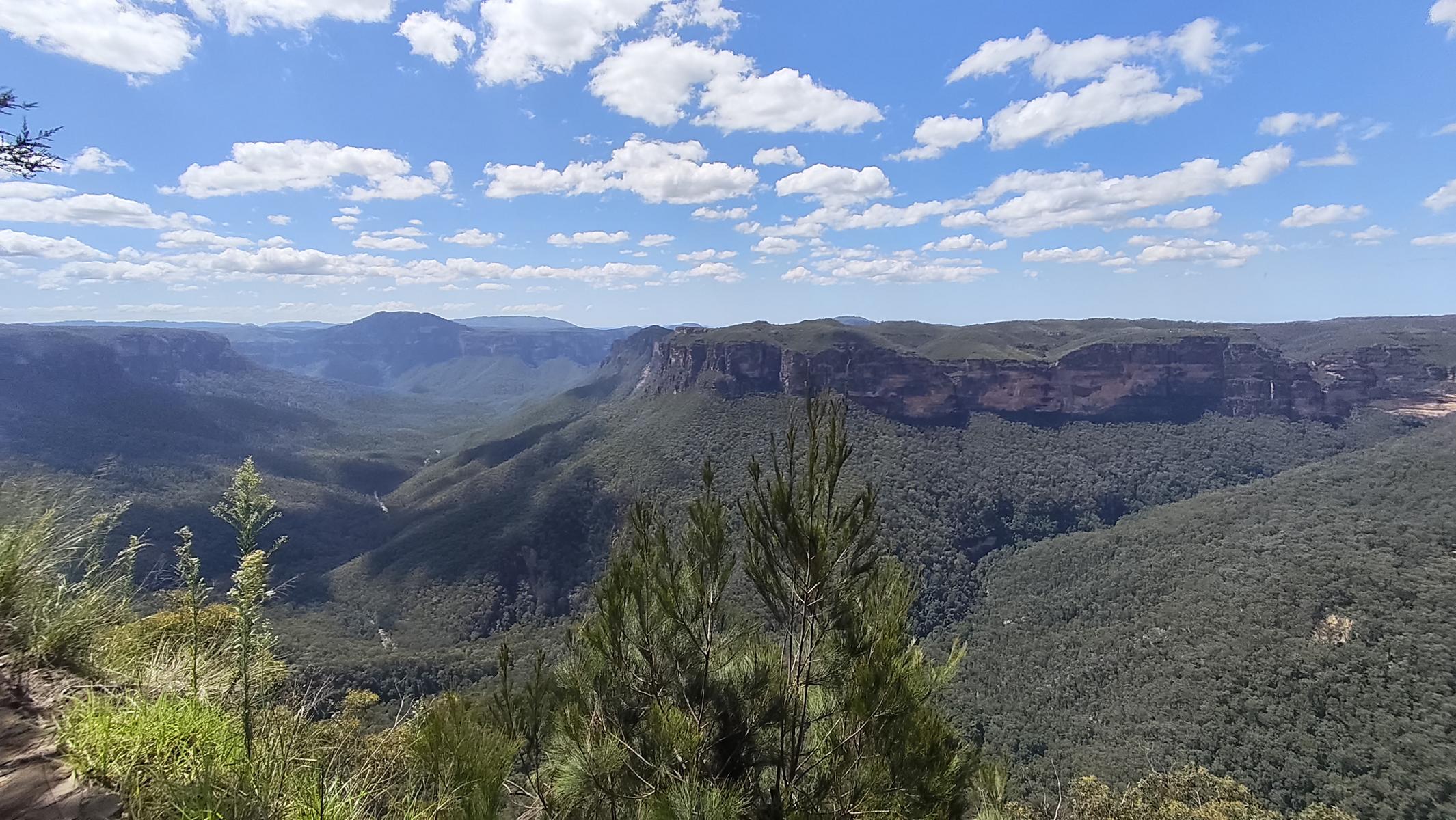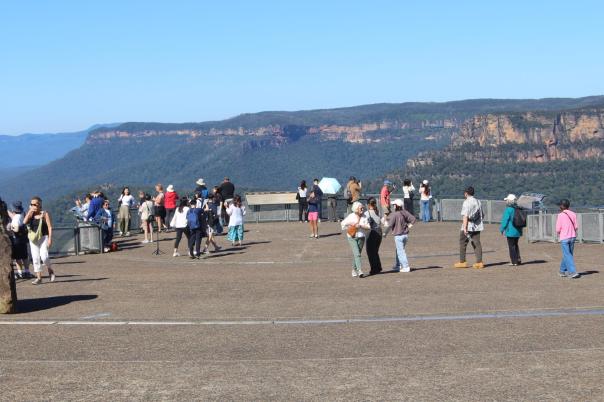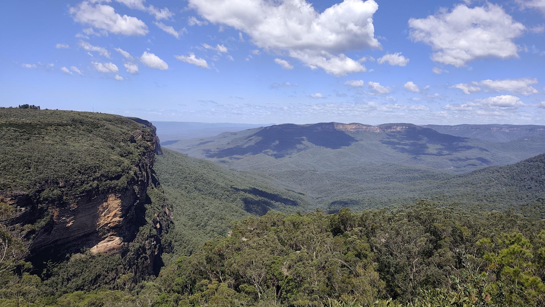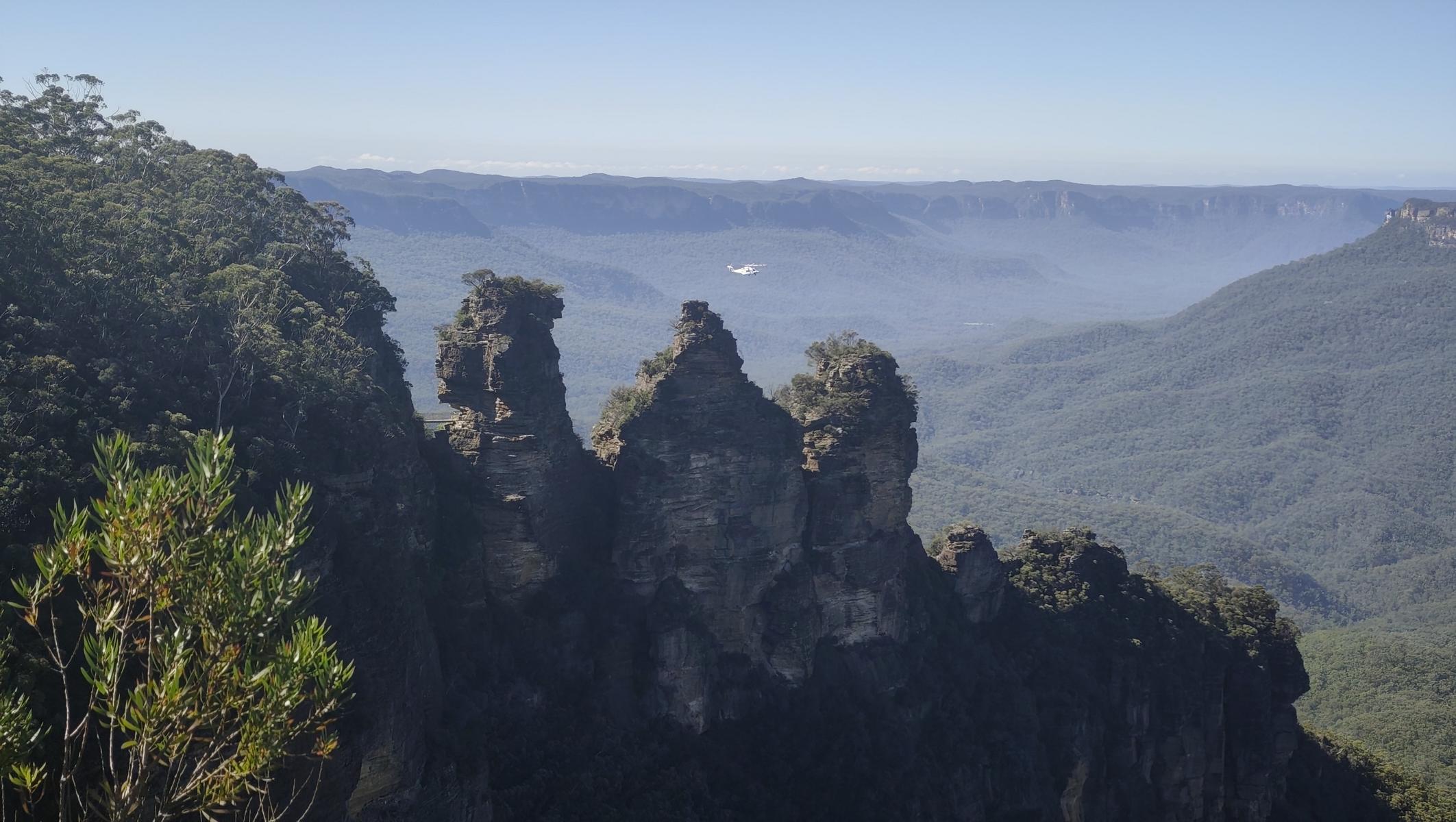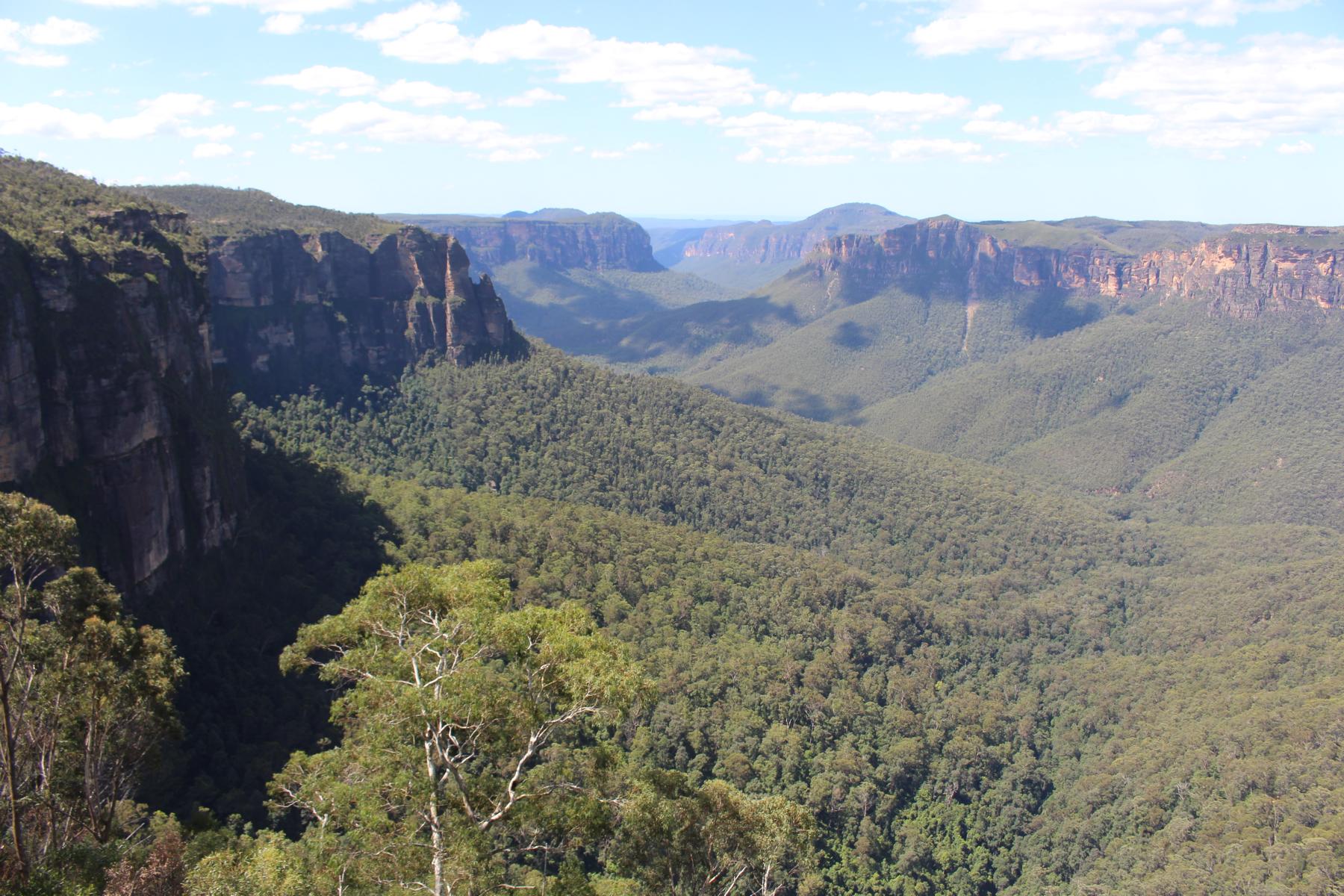 Die Blue Mountains liegen auf einem ca. 1.000 m hohem Hochplateau und über Jahrmillionen schufen Wasser, Wind und Erosion den Canyon mit seinen steilen Klippen. Im Tal schimmern die Eukalyptusbäume leicht bläulich und es riecht nach Eukalyptusöl. Zahlreiche wunderschöne Tages oder Mehrtageswanderungen durchziehen den Canyon. Von der Canyon Kante bieten zahlreiche Aussichtspunkte, atemberaubende Blicke in das Tal. Da die Wege noch sehr nass sind, bestaunen wir die Blue Mountains dieses Mal von oben.