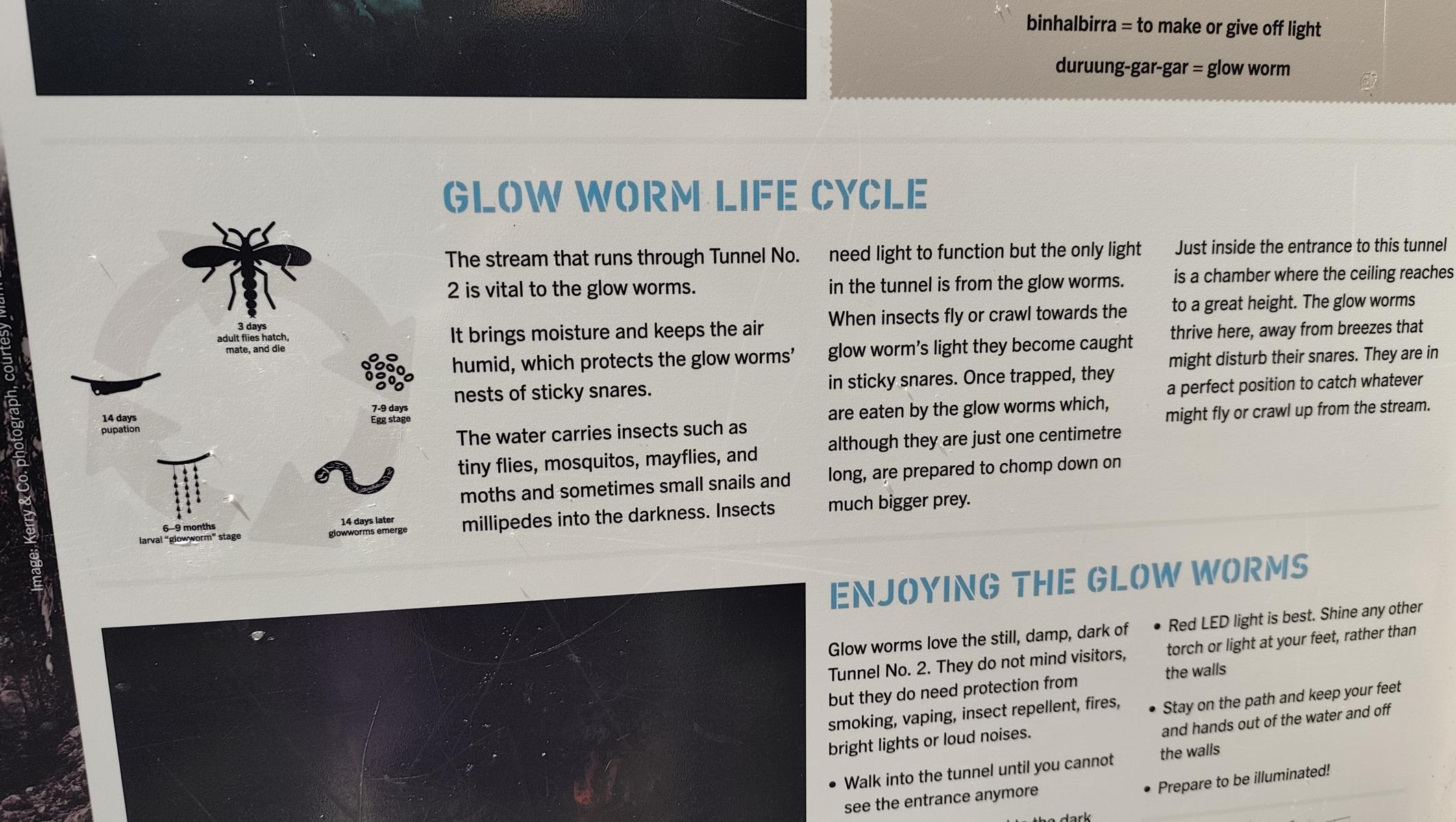 Glow Worms sind keine echten Würmer sondern kleine Larven einer Pilz-Mücken-Art. Sie erzeugen ein faszinierendes blau-grünes Licht mit dem sie ihre Beute anlocken und leben in Höhlen oder feuchten Schluchten. Nachdem der Tunnel aufgegeben wurde, entdeckten sie ihn und zogen ein. Die Dunkelheit und das kleine Bächlein das durch ihn fließt sind ein idealer Lebensraum für sie.