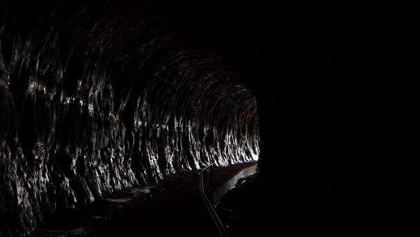 Wir fahren erst mal auf einer 30 km langen Schlagloch durchsetzten Schotterpiste und wählen den längeren Wanderweg um zum Tunnel zu gelangen. Wissen nicht so recht was uns erwartet und gehen mit mulmigen Gefühlen in die Höhle. Kein Licht, es wird immer dunkler bis wir die Hand nicht mehr vor den Augen sehen. Zum Glück hat die Parkverwaltung einen Handlauf durch die Höhle gezogen an dem wir uns entlang hangeln können. Dafür glitzern an den Wänden herrliche kleine Punkte, die Ähnlichkeit des Sternenhimmels in dunklen Nächten haben. Knapp 400 m zieht sich der Tunnel in vollständiger Dunkelheit dahin und am Ende sind wir froh wieder ans Licht in eine feuchte Regenwaldoase zu kommen. Die Natur hat sich den Ort in den 100 Jahren seit des menschlichen Eingreifens wieder für sich zurückgeholt und strahlt in aller Schönheit. Wie so oft sind wir auch hier ganz für uns allein.