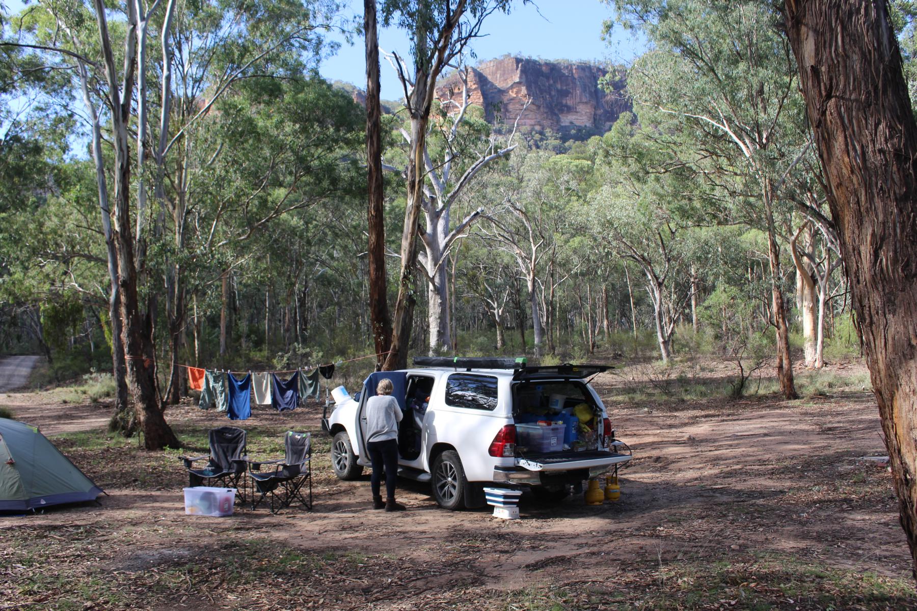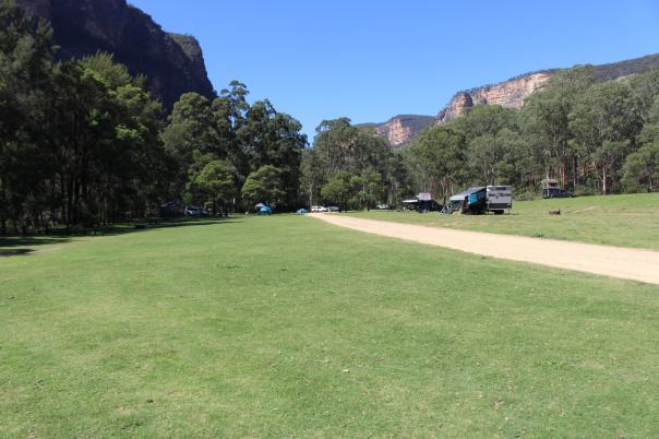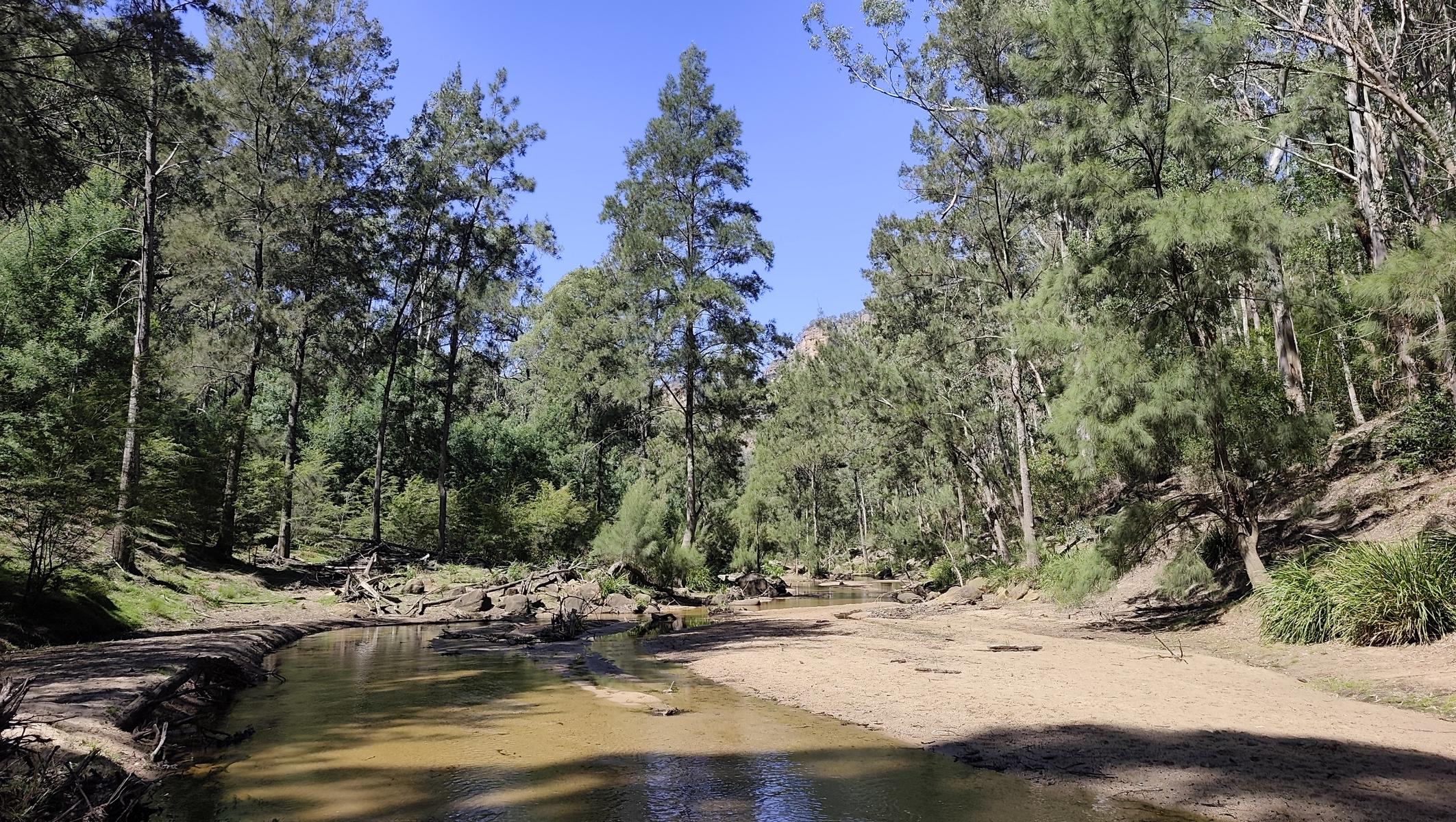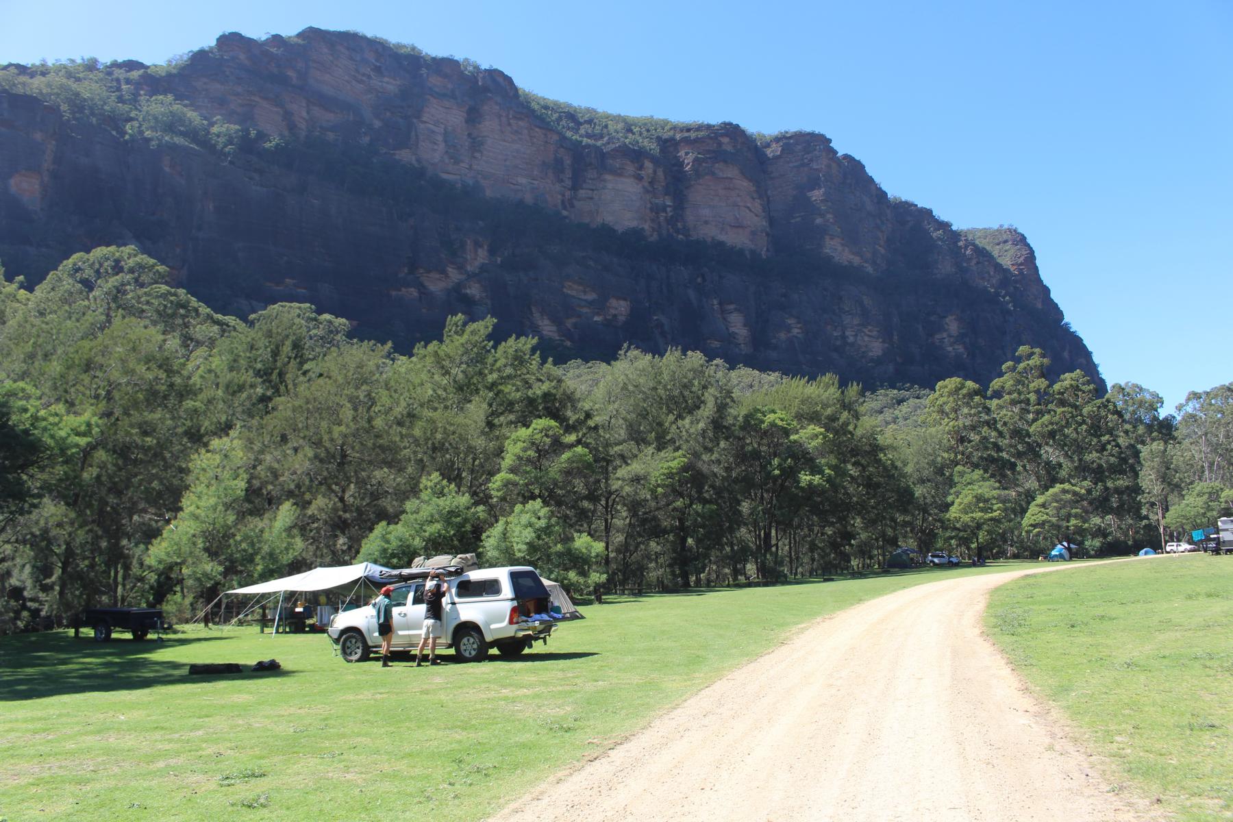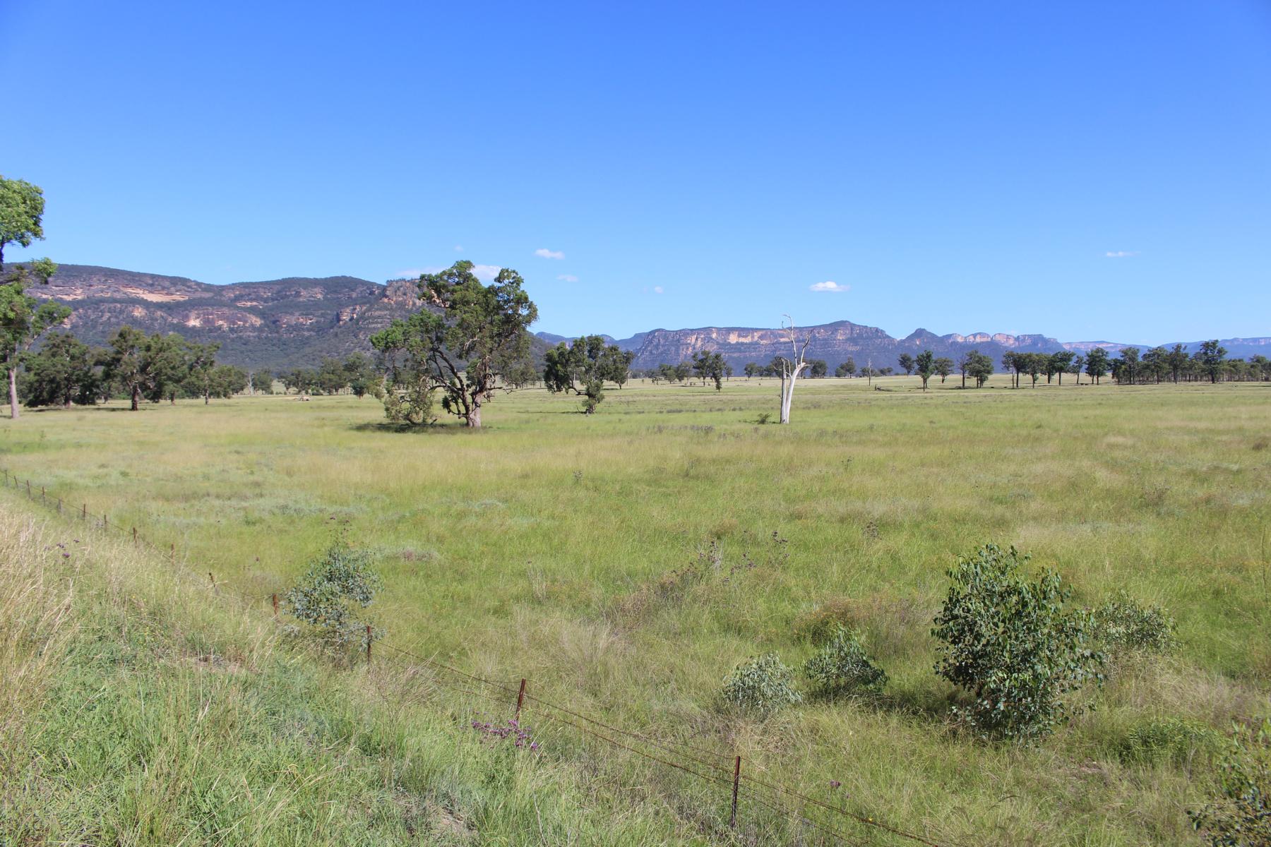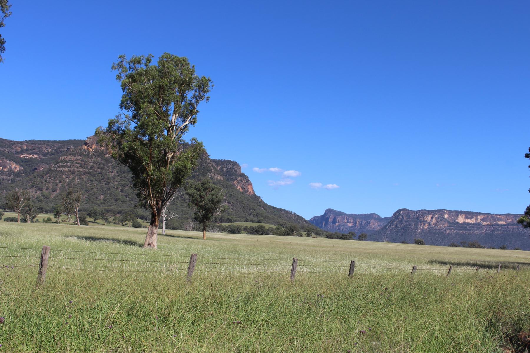 Und weiter geht es ins Capertee Valley dem breitesten Canyon der Welt. Canyon ist vielleicht der falsche Name dafür, da das Tal zwar von Felswänden umgeben ist, der Boden jedoch eine riesige grasbewachsene Ebene darstellt. Dort besuchen wir den Coorongooba Campground im Wollemi NP, an einem Bach, umgeben von Canyonwänden.