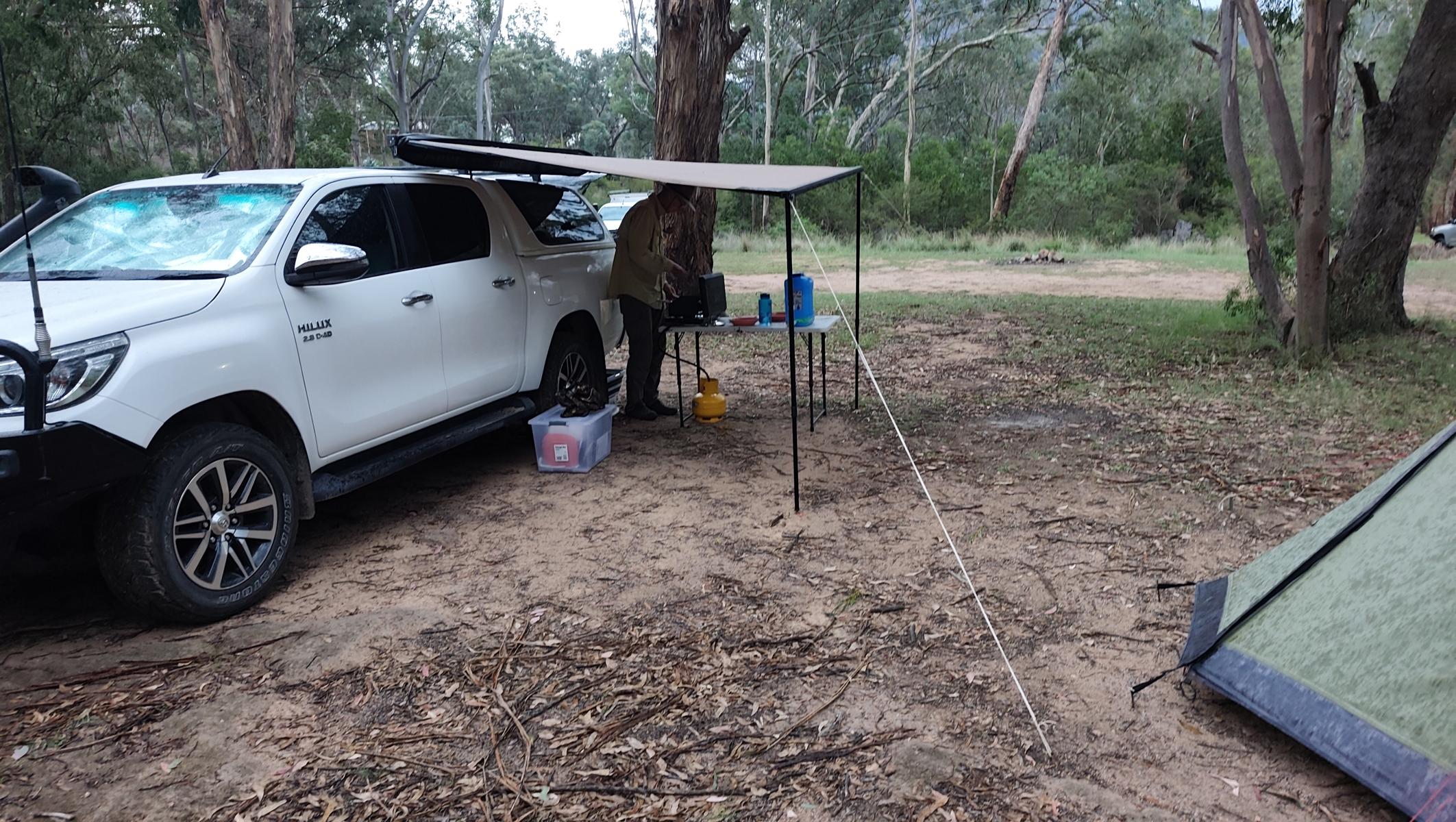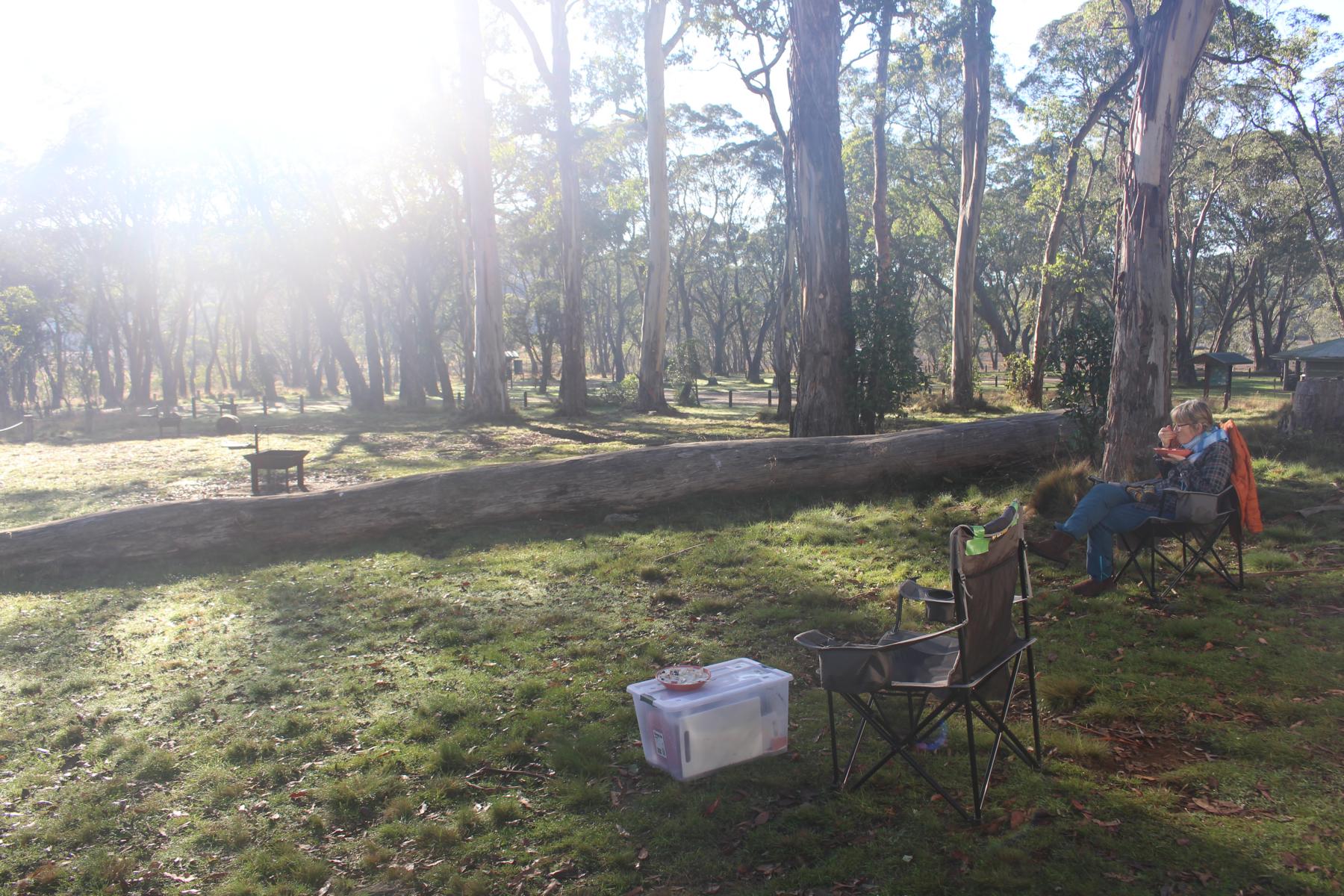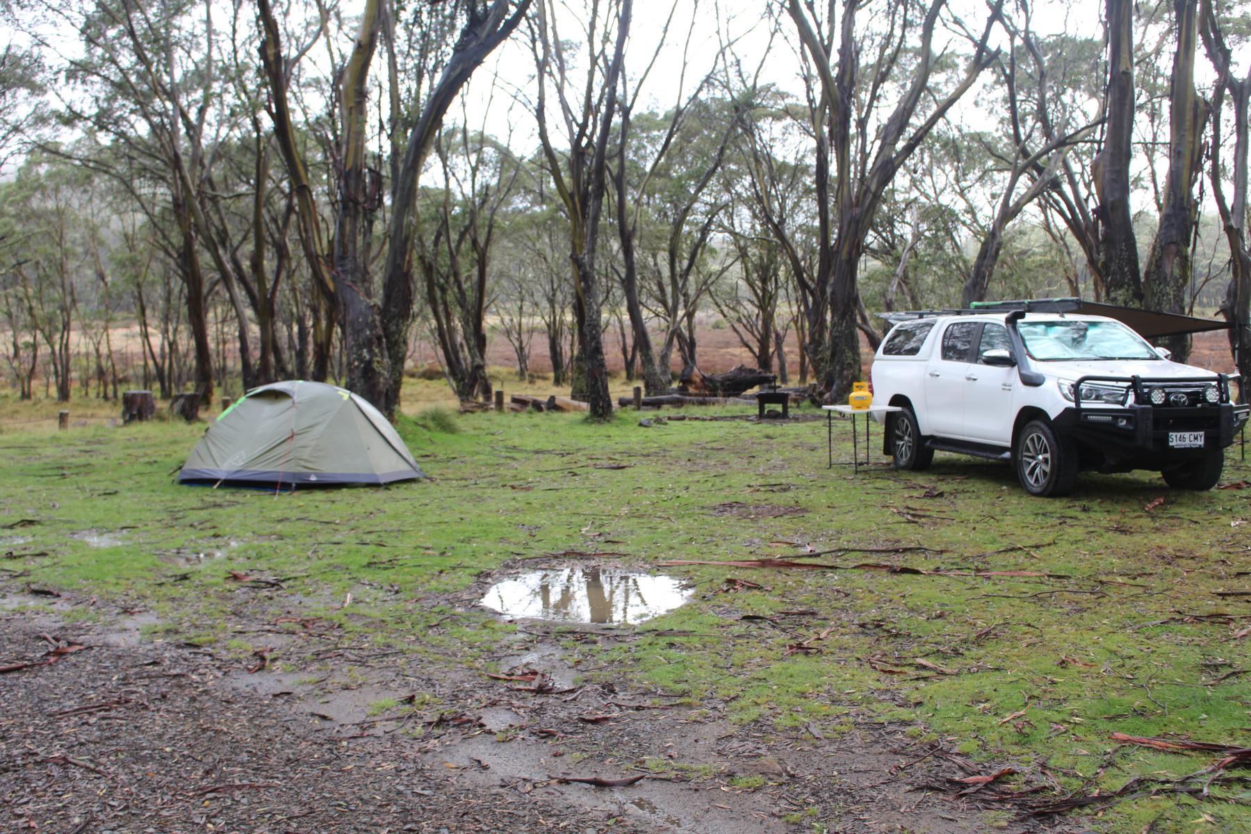 Der Park ist bekannt für seine schnellen Wetteränderungen, welche sich als richtig herausstellen. Bei schönstem Wetter kommen wir nach der Fahrt durch den Park zurück zum Camp und genießen unseren Kaffee. Die Wolken ziehen immer mehr zusammen und abends fängt es leicht zu tröpfeln an, was unter unserem Tarp kein Problem ist. Als der Wind auffrischt und die Temperaturen nach unten gehen, ziehen wir uns ins Zelt zurück und erleben eine stürmische, regnerische und kalte Nacht. Zum Glück macht das Zelt einen super Job und wir bleiben trocken. Der andauernde Regen am Morgen lässt uns in den überdachten Pavillon zurückziehen, wo wir mit anderen Campern, dass Beste aus der Situation machen und uns bei eisigen Temperaturen das Frühstück schmecken lassen.