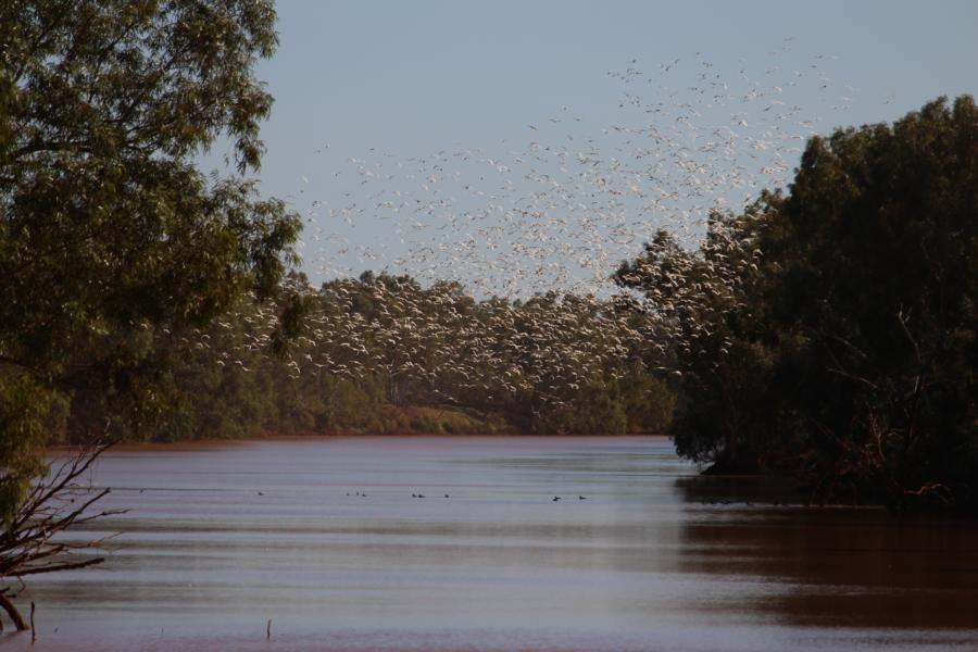 Ein Schwarm Little Corellas fliegt auf, Ashburton River