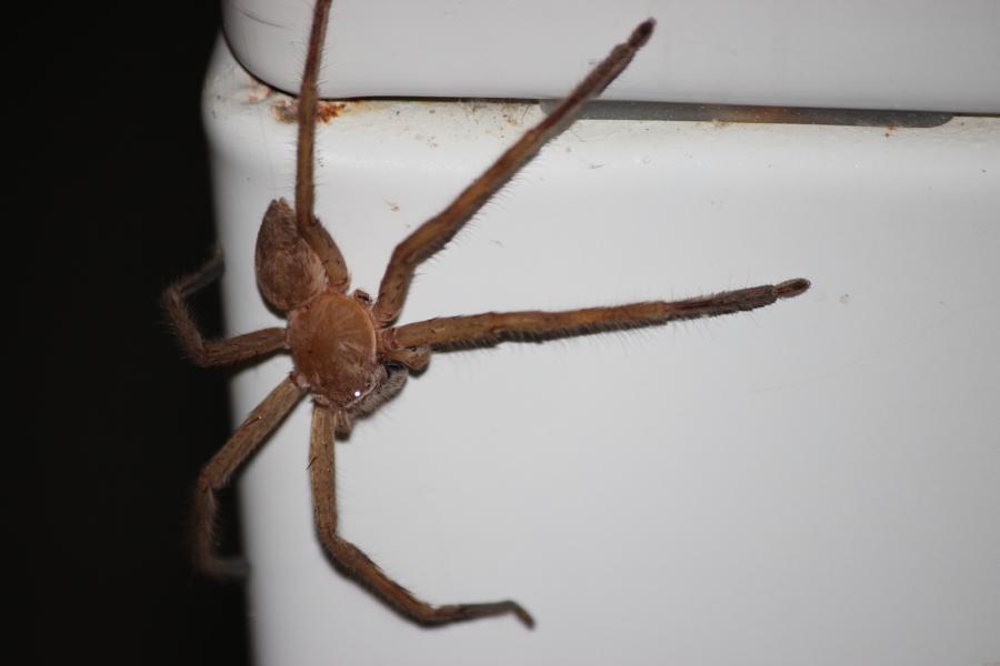 Schreck in der Abendstunde bei der Damentoilette, ein Huntsman Spider, Körper imponierende gute 5 cm